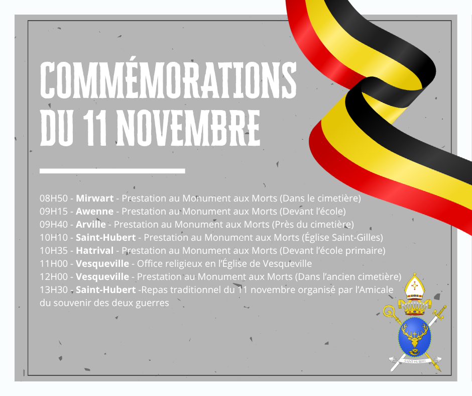 L’amicale du souvenir des deux guerres et la Ville de Saint-Hubert vous présentent les différents hommages organisés concernant les commémorations de l’Armistice du 11 novembre 1918.