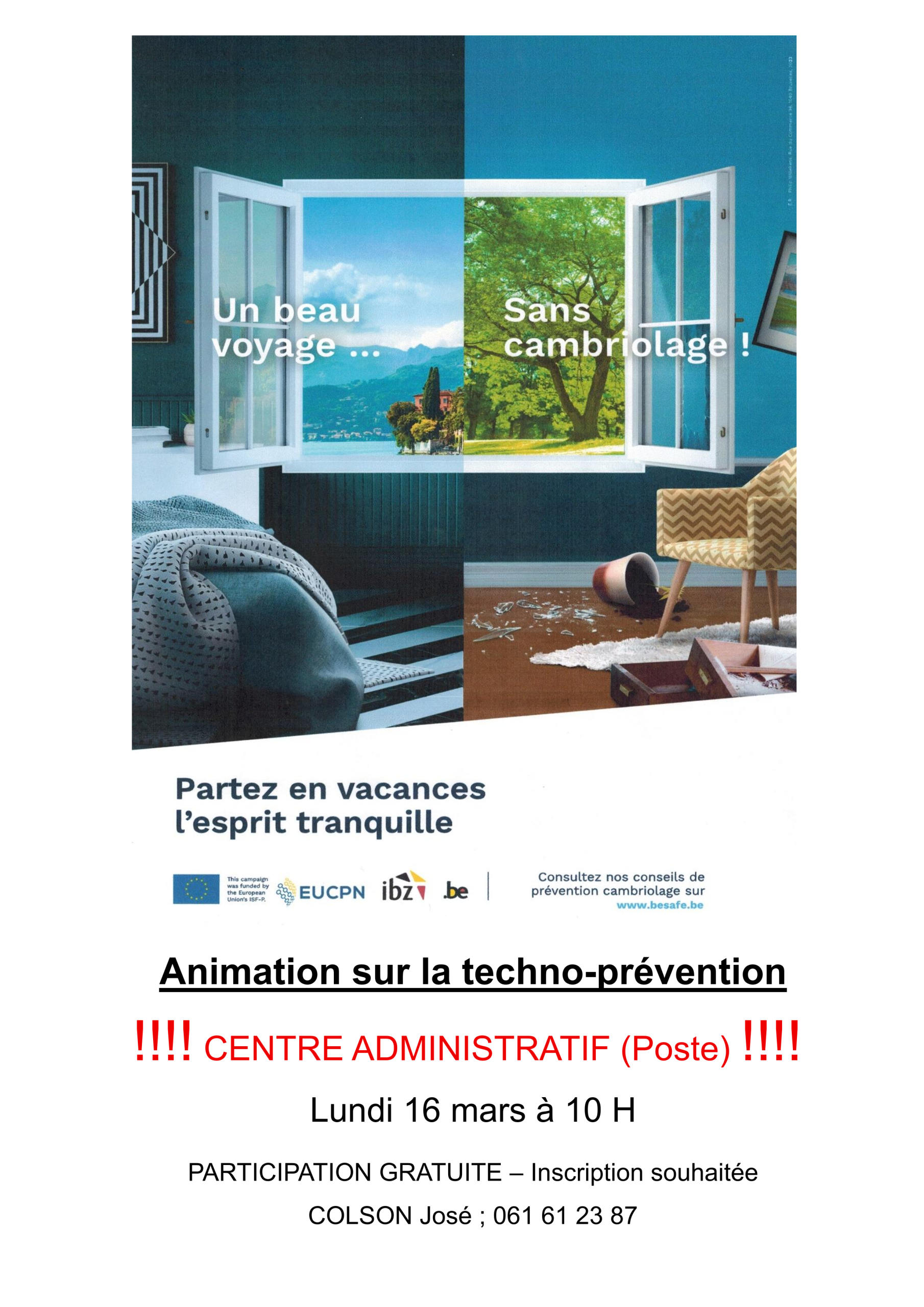 Quand ? Lundi 16 mars à 10h00 Où ? Centre administratif (Avenue Nestor Martin 10 A) PARTICIPATION GRATUITE – Inscription souhaitée Contact : COLSON José ; 061 61 23 87