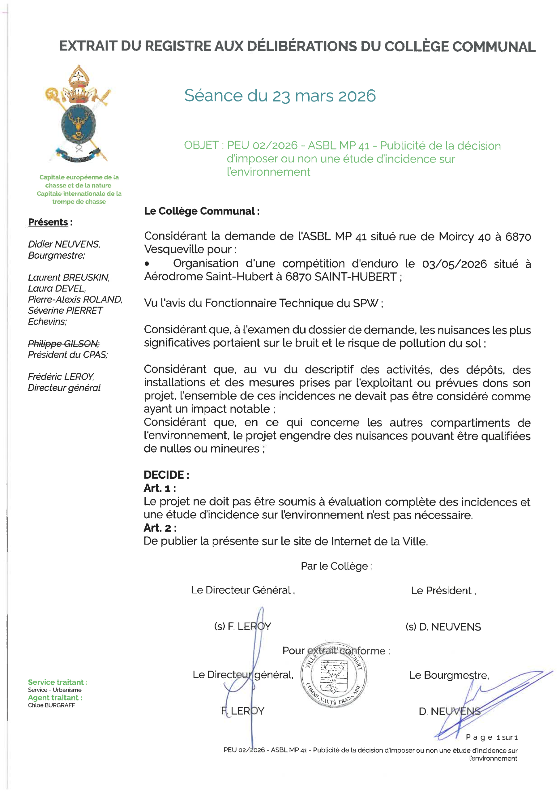 Retrouvez ici la décision du Collège communal du 23 mars 2026 relative à la publicité de la décision d’imposer ou non une étude d’incidence sur l’environnement pour l’organisation d’une compétition d’enduro le 03/05/2026 à l’aérodrome de Saint-Hubert.